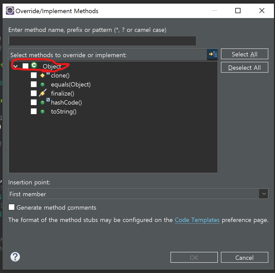 extends를 쓰지 않더라도 Object는 기본적으로 상위클래스에 있다.