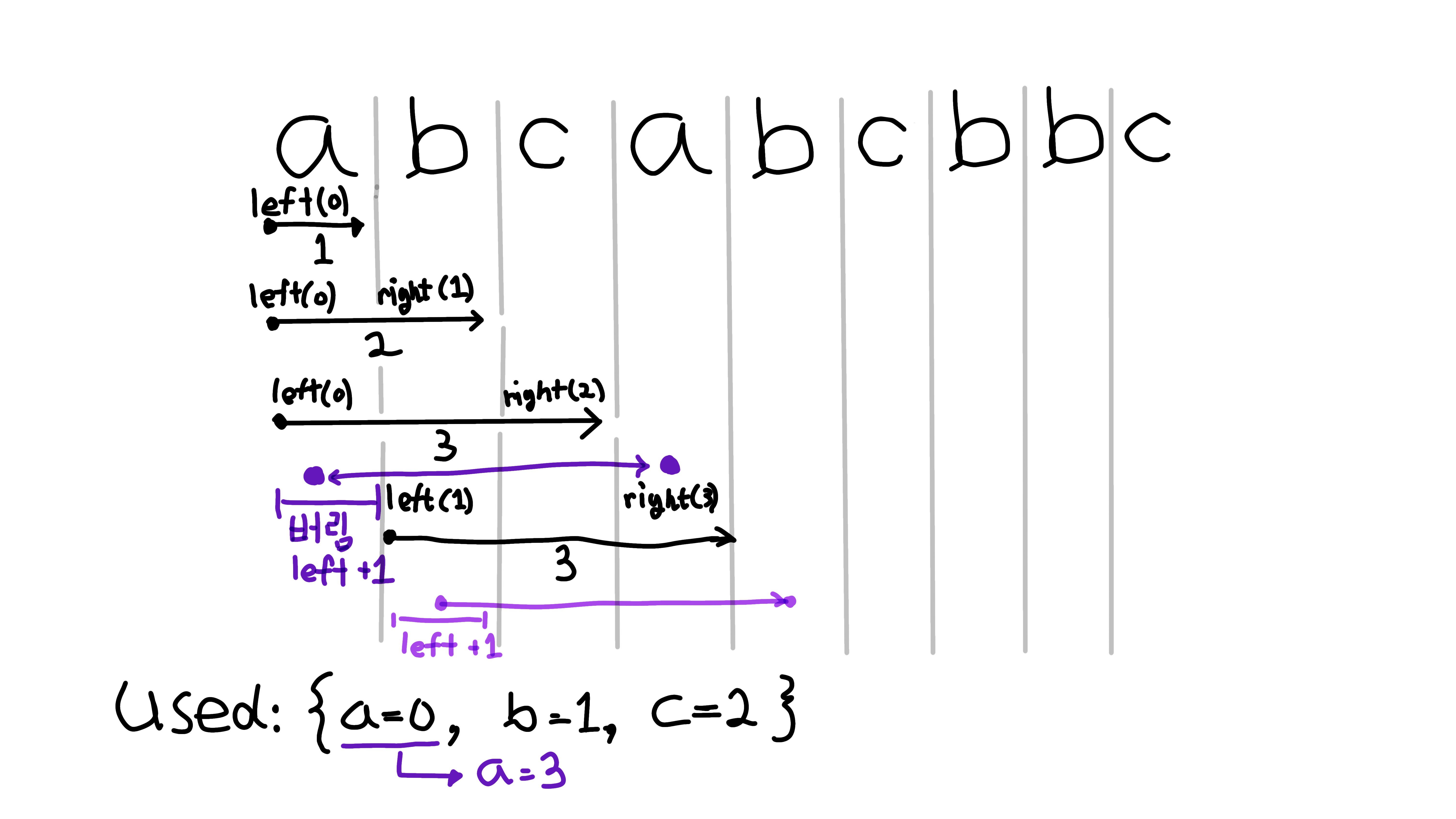 3번째 인덱스 a를 순회할 때 '0번째 인덱스'에 'a'가 있다는 것을 알아야한다.