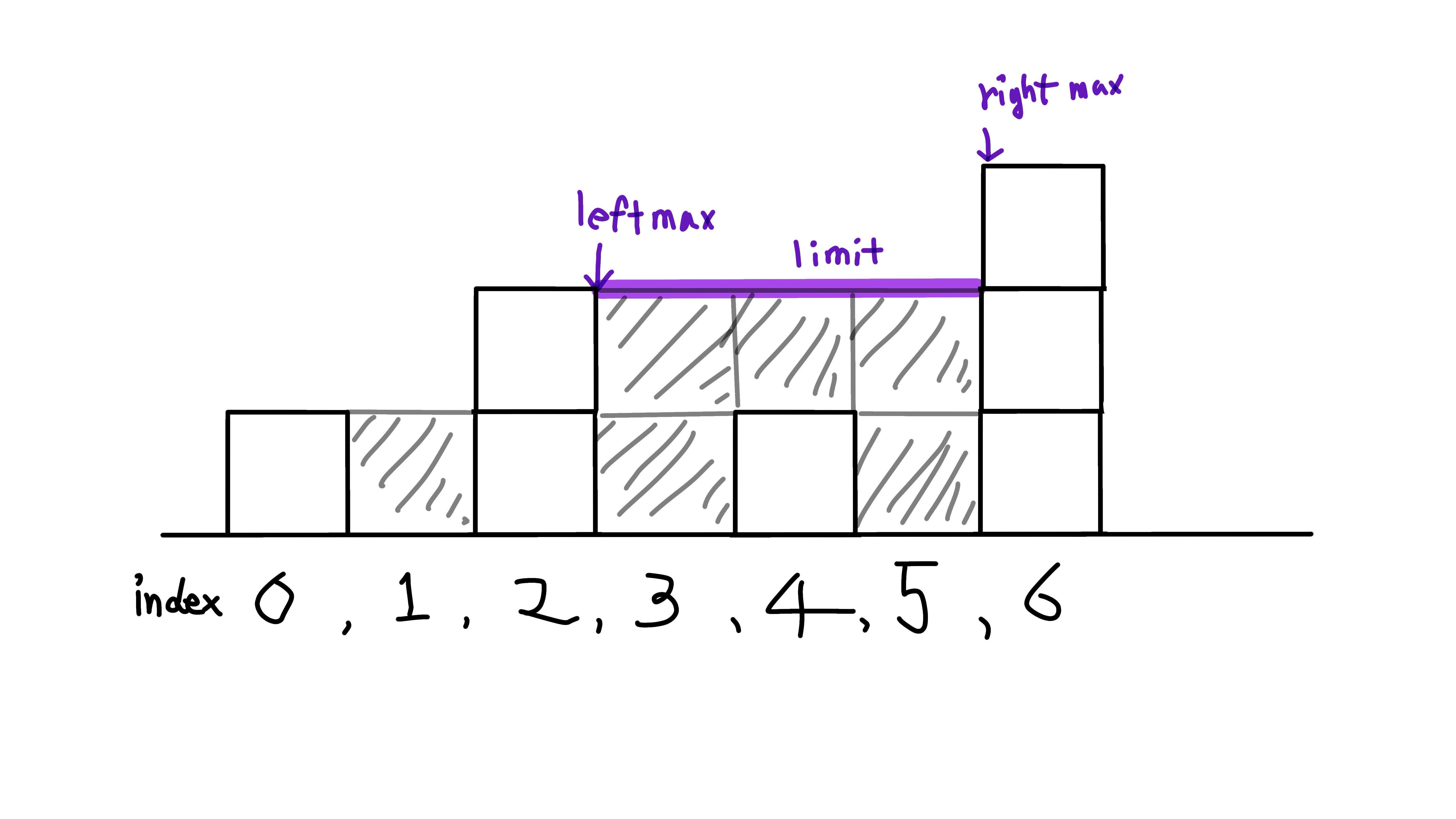 인덱스 2와 6사이에 채워진 volume은 left max의 값인 2가 한계다.