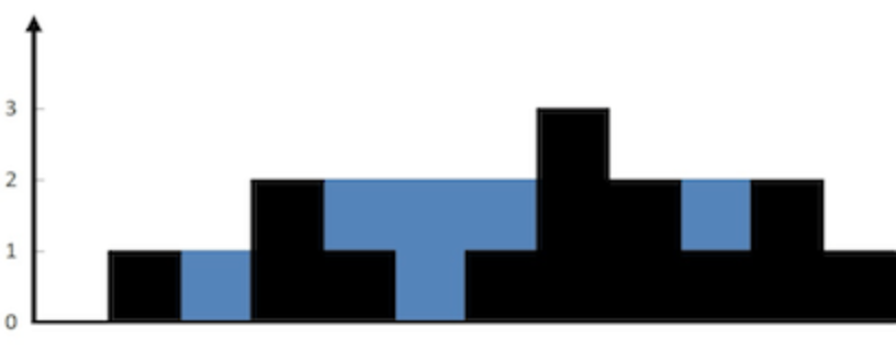 Explanation: The above elevation map (black section) is represented by array [0,1,0,2,1,0,1,3,2,1,2,1]. In this case, 6 units of rain water (blue section) are being trapped.