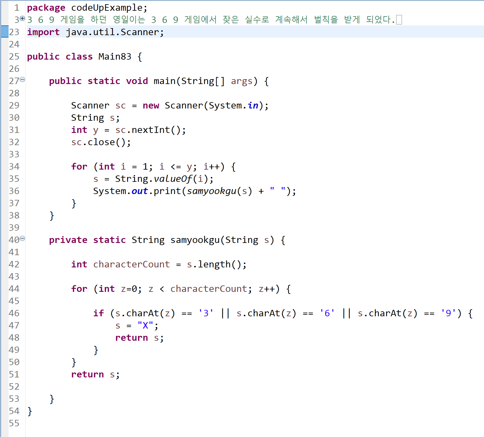 반복문에서는 charAt()를 통해 해당 글자가 3, 6, 9 인지 확인하고